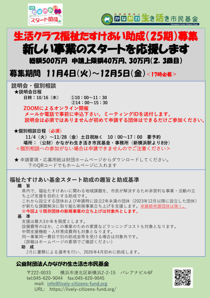 11月4日(火)より、第25期生活クラブ福祉たすけあい助成(スタート助成)の募集を開始いたします。 募集締め切りは、12月5日(金)となります。