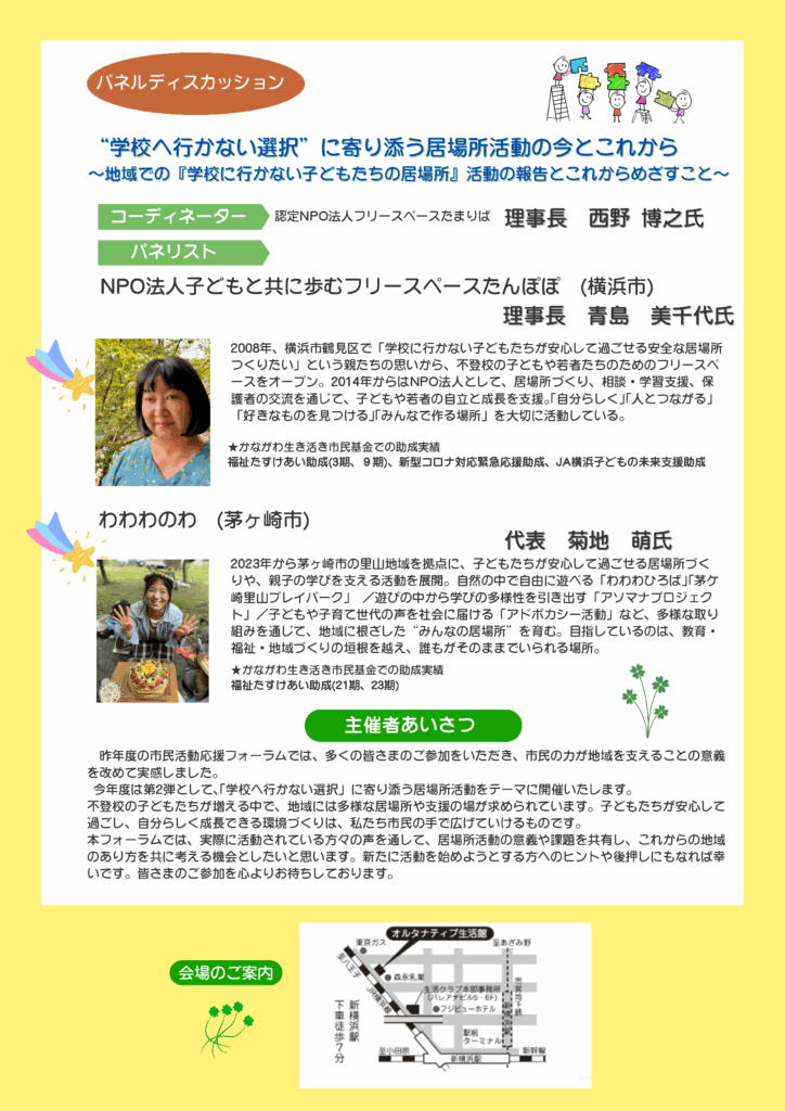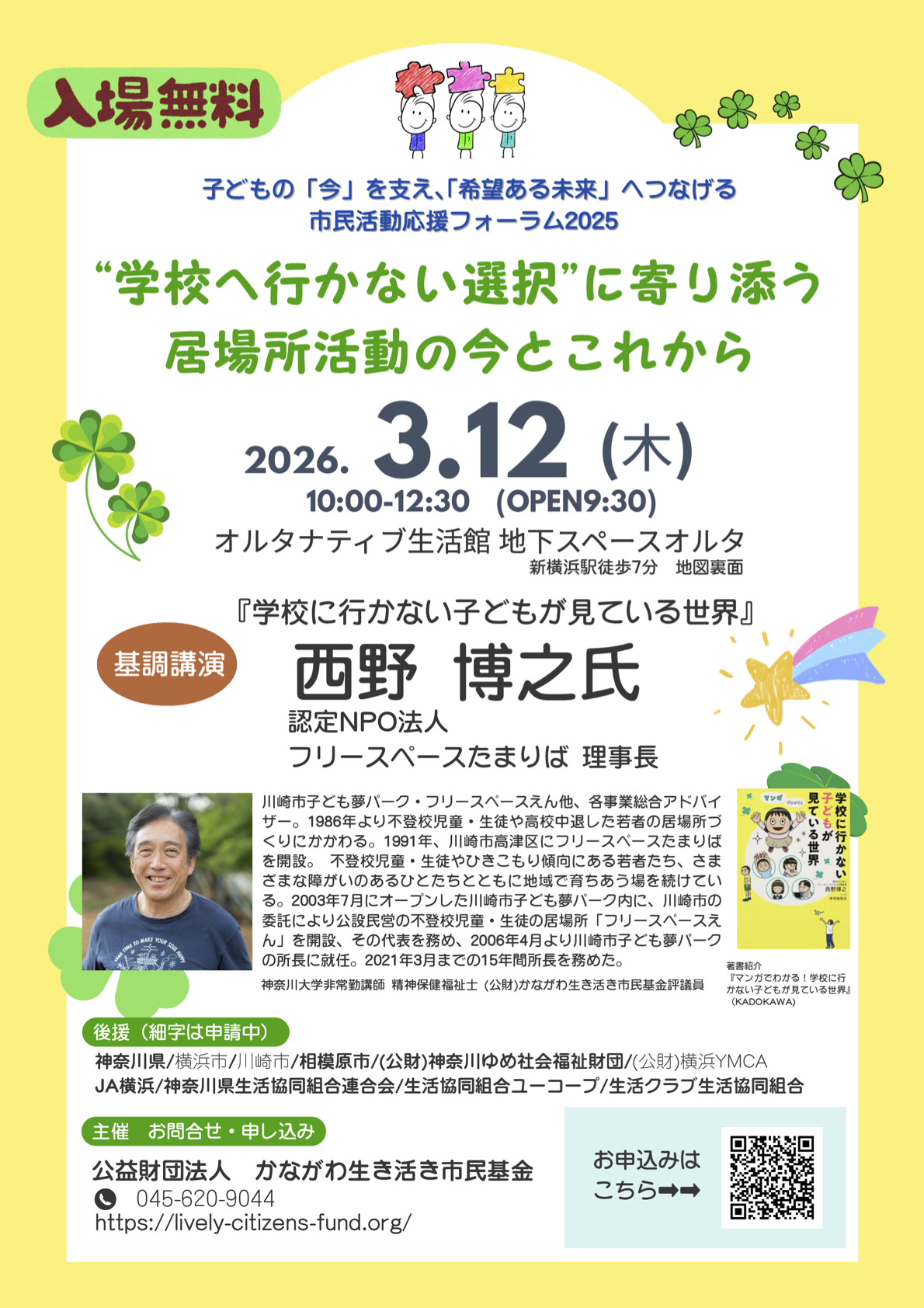 かながわ生き活き市民基金では、無料学習支援を切り口に地域で支え合うネットワークづくりを考える、『子どもの「今」を支え、「希望ある未来」へつなげる市民活動応援フォーラム2025 ‘学校へ行かない選択” に寄り添う居場所活動の今とこれから』を2026年3月12日(木)に開催いたします。