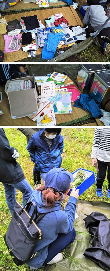 雨除けのタープテントの下に折り畳み机をセットし、受付コーナーとお菓子の入った段ボールを広げる。3時を過ぎると、子どもたちが次々とノートに名前を記入し、気に入ったお菓子や食料品を受け取っていく。